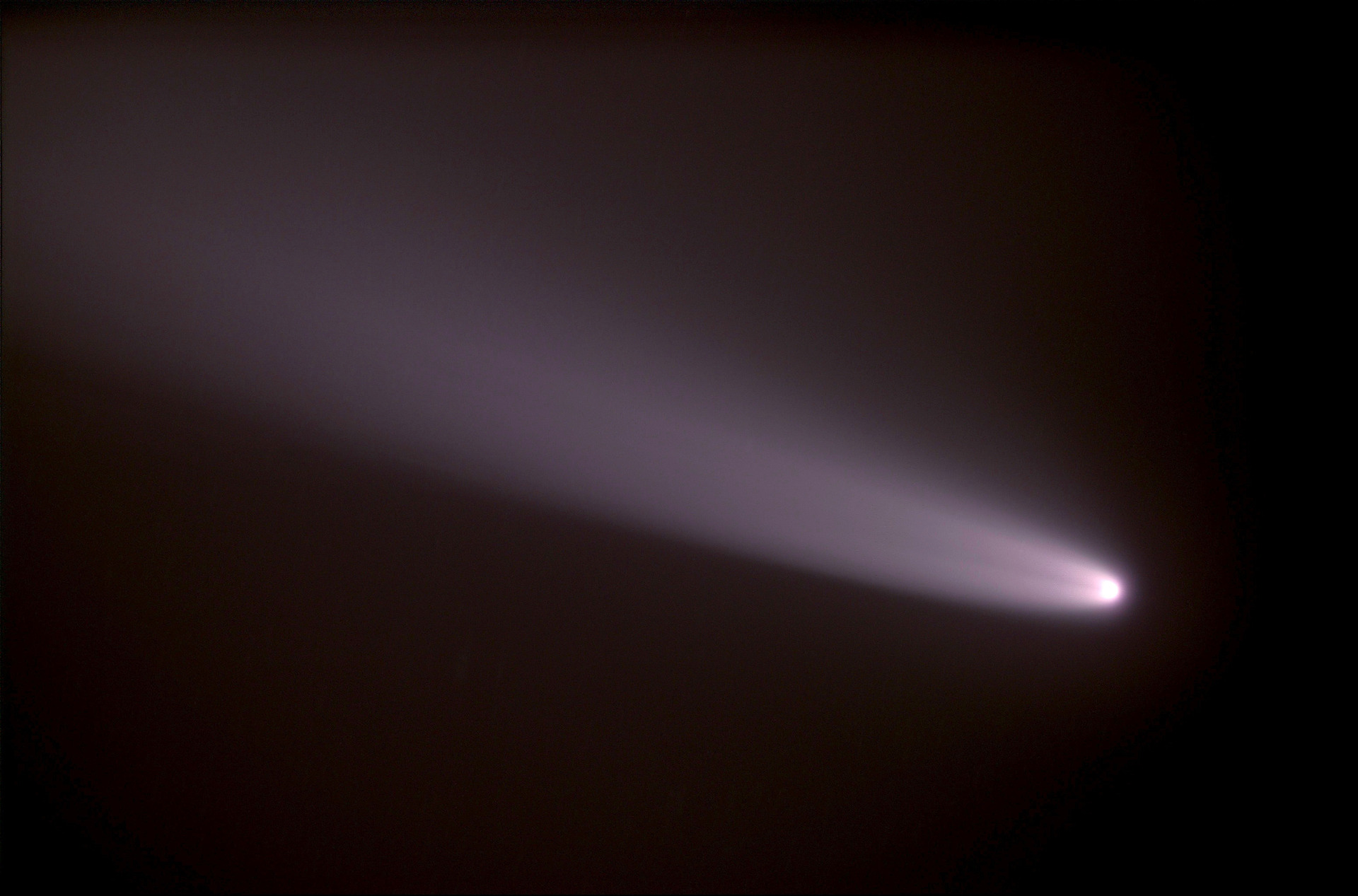 Links: Komet C/2020 F3 (Neowise), aufgenommen am 22./23. Juli um Mitternacht am Observatorium Hoher List mit Canon EOS 1100Da und Sigma Telezoom (f = 135 mm); 45 Belichtungen à 14 Sekunden gestackt. Da das Stacken auf dem Kometenkopf durchgeführt wurde, damit das Bild des Kometen scharf wird, sieht man dessen Bewegung anhand der kurzen Strichspuren der Sterne. Der Komet hat sich während der Belichtungszeit von 10,5 Minuten ein klein wenig nach links oben bewegt. Die Umgebung (Bäume etc.) ist aufgrund der Erddrehung unscharf abgebildet. Deutlich sieht man den Plasmaschweif, der bläulich schimmernd und schnurgerade in Richtung 11 Uhr nach oben links verläuft. Wenn man ihn in die entgegengesetzte Richtung nach unten verlängert, weiß man genau, in welcher Richtung die Sonne steht. Der Plasmaschweif wird durch das Licht der Sonne verursacht, das mit seinem Photonendruck Material aus dem Kometen hinaustreibt und dabei ionisiert (der Plasmaschweif leuchtet somit selbst). Der Staubschweif hingegen verläuft leicht gekrümmt nach oben und leuchtet durch reflektiertes Sonnenlicht. Die Krümmung wird durch die Bewegung des Kometen (nach links oben) verursacht.