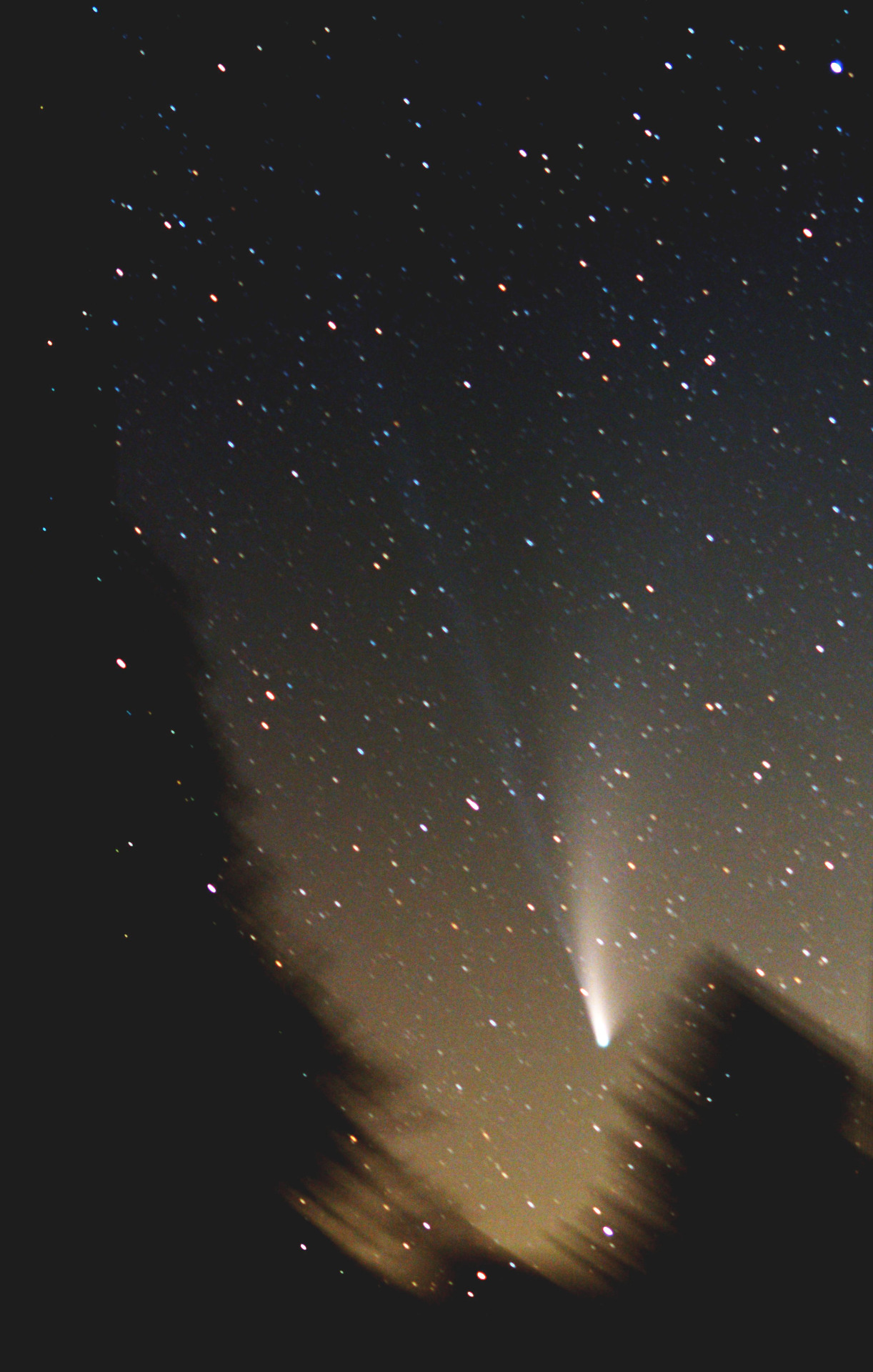 Unten: Zeitraffer-Video von 8 Minuten Belichtungszeit. Man erkennt hier sofort die Drehung der Erde. Der Komet sinkt tiefer und ist bald hinter den Bäumen verschwunden. Im Zeitraffer fliegen auch einige Satelliten durchs Blickfeld.