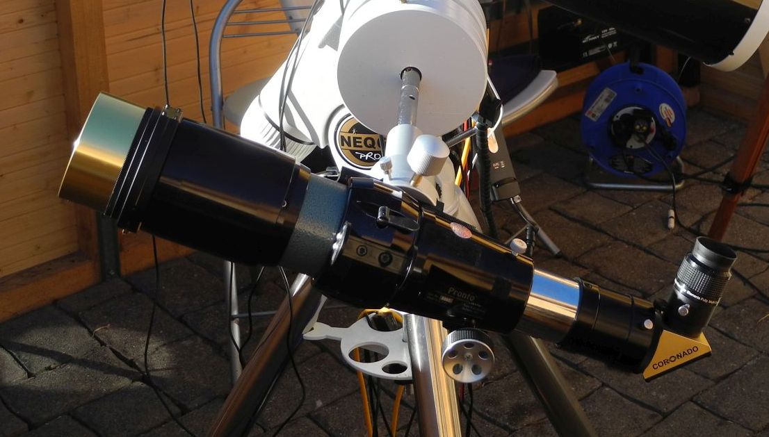 mit Coronado SolarMax II 60 mm Hα-Sonnenfilter mit RichView Tuning und 15 mm BF, hauptsächlich für Sonnenbeobachtung genutzt.