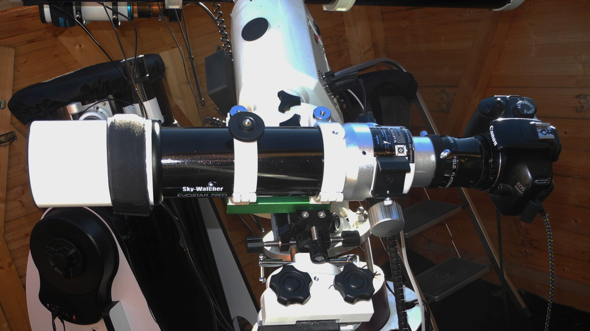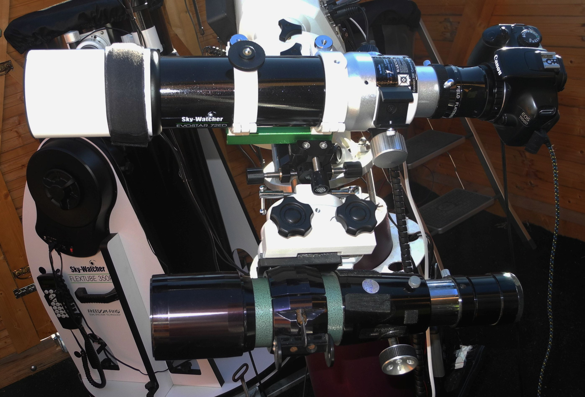 Skywatcher Evostar 72 und Televue Pronto ED-Refraktoren auf der Gegengewichtsachse. Beide Refraktoren lassen sich mittels Adaptern präzise parallel zum